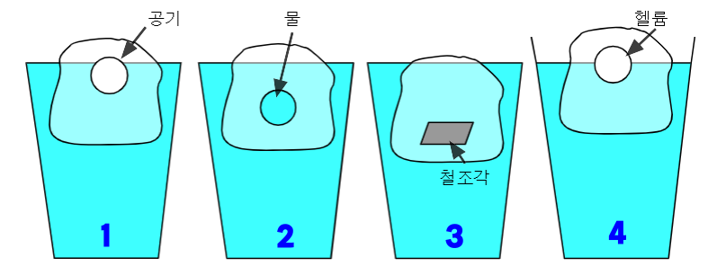 4. 속에 공기보다 가벼운 헬륨가스가 들어있는 얼음이 물위에 떠 있다가 녹으면?