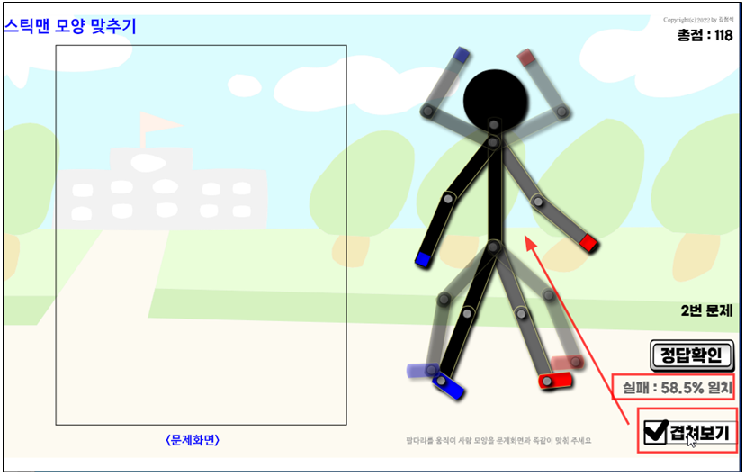 왼쪽에 보여지는 문제 화면을 보고 오른쪽에 있는 스틱맨의 관절을 조절해서 똑같게 만드는 게임이다.