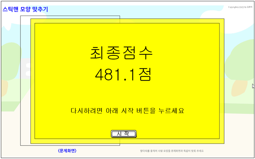 시작화면 문제화면이 5초간 보여졌다가, 사라진다. 그럼 그때 부터 오른쪽 스틱맨을 똑같은 모양이 되게 만들면 된다.