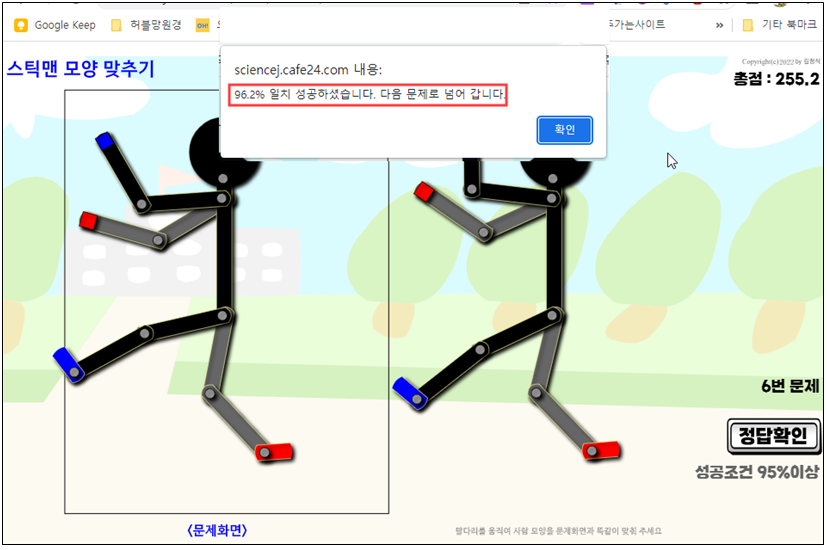 동작을 맞추고 확인버튼을 눌렀을 때 95% 이상 맞춰야지 다음 문제로 진행할 수 있다.