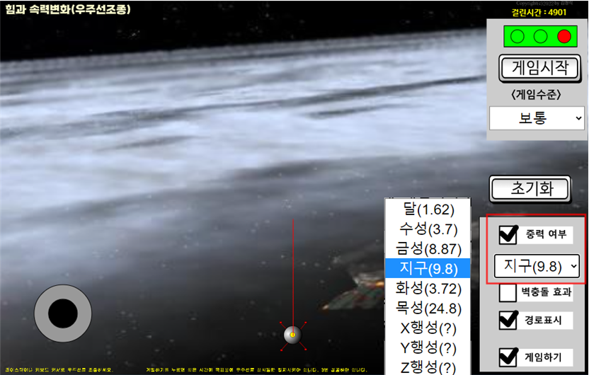 힘과 속력변화를 보여주기 위해 우주선 조절게임을 만들었다. 우주선은 우주공간에 있어서 작용하는 힘이 없다고 가정하고 키보드 방향키를 이용해서 우주선을 운동시킬 수 있다. 옵션에서 중