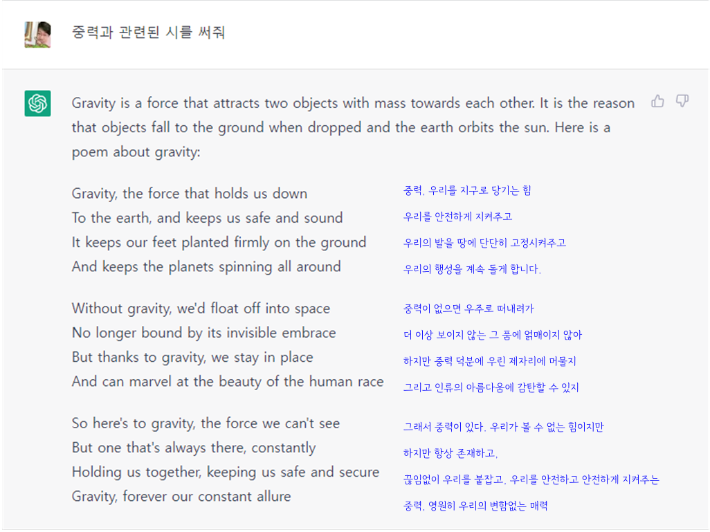 영어로 답변한 중력 관련 시 번역