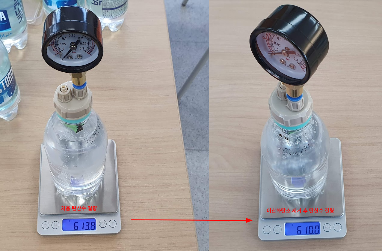첫번째는 탄산수를 절반만 남기고, 하나는 압력을 넣은채로, 하나는 그냥 뚜겅만 닫은채로 하루동안 놓아 둔 후 질량을 측정해 봤는데 감소한 질량이 0.4g 으로 거의 똑같다.