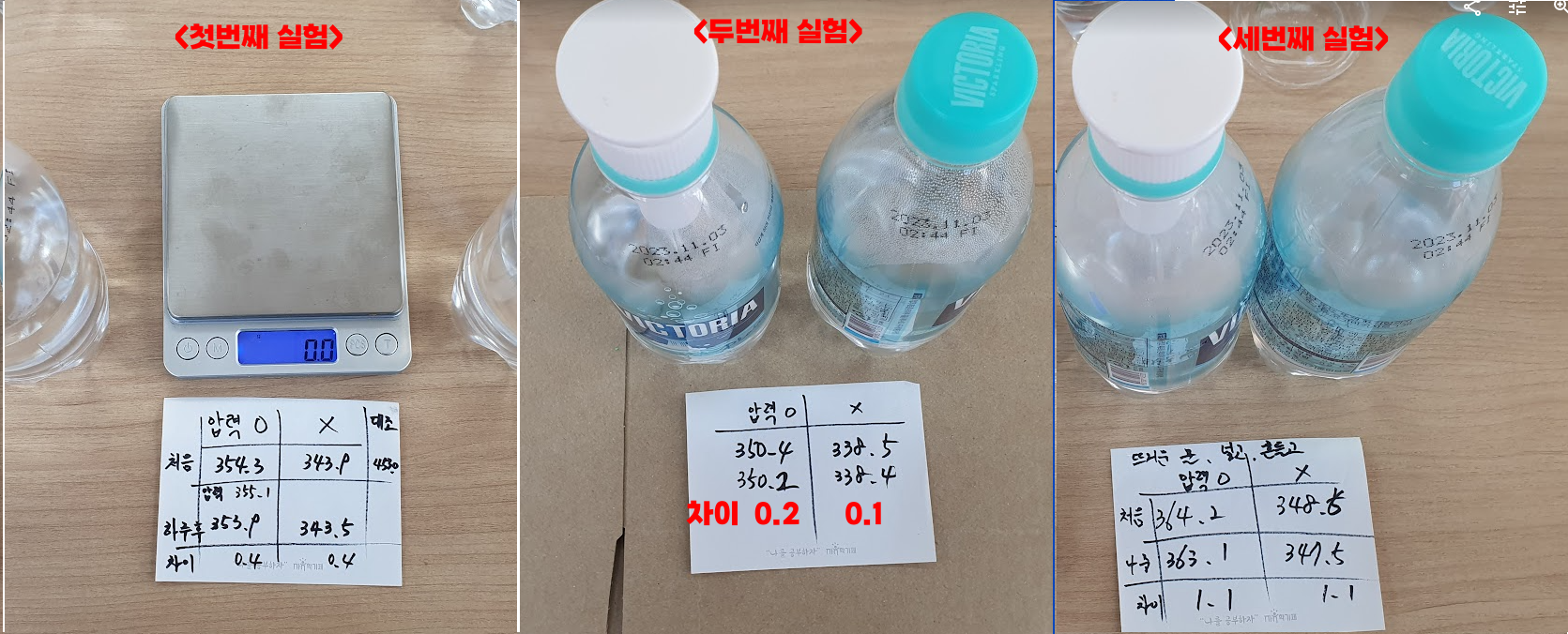 마지막으로 압력을 넣은것과 넣지 않은 절반만 남긴 탄산수를 뜨거운 물에 담그고, 힘껏 흔들고 해서 이산화탄소 발생을 일부러 촉진시켰다. 그리고 나서 질량을 측정했는데 차이가 1.1g 으로 똑같았다.