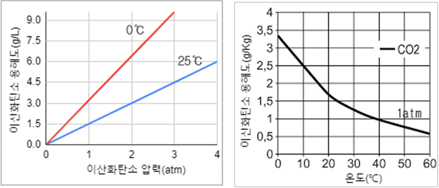물 1L에 녹아있는 이산화탄소 양은 1기압이 증가할때 마다
