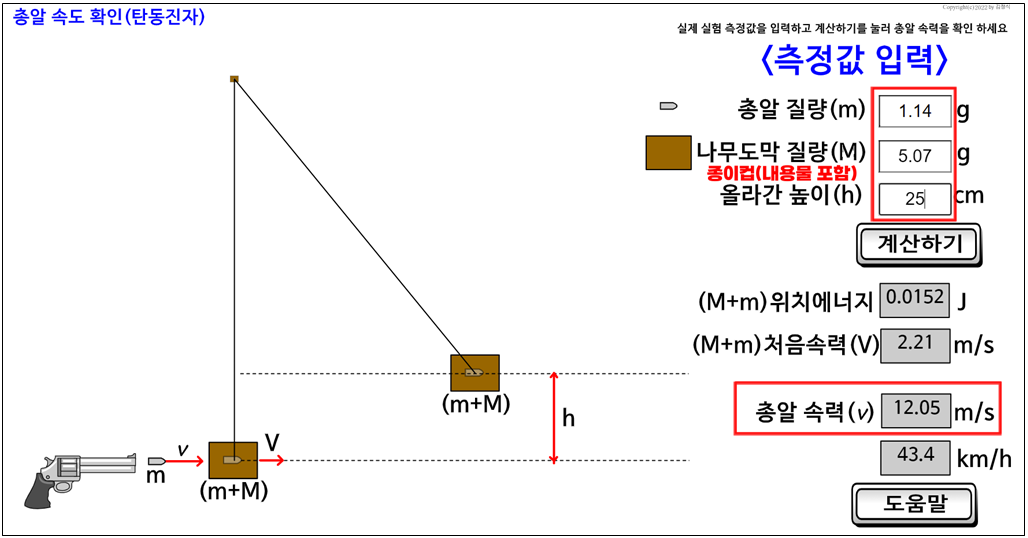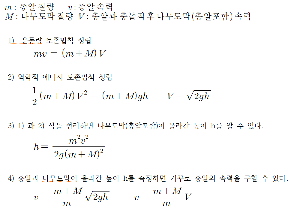 역학적 에너지 보존법칙을 이용하면 가장 낮은 위치에서 종이컵(총알포함)의 운동에너지를 구해서 속력(V)을 알아낼 수 있다. 그리고 순수한 총알의 속력(v)은 = V * (M+m)/m 계산식으로 알아낼 수 있다.