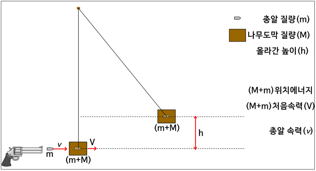 총알의 속력을 구하는 원리는 역학적 에너지 보존법칙과 운동량 보존법칙을 이용한다.