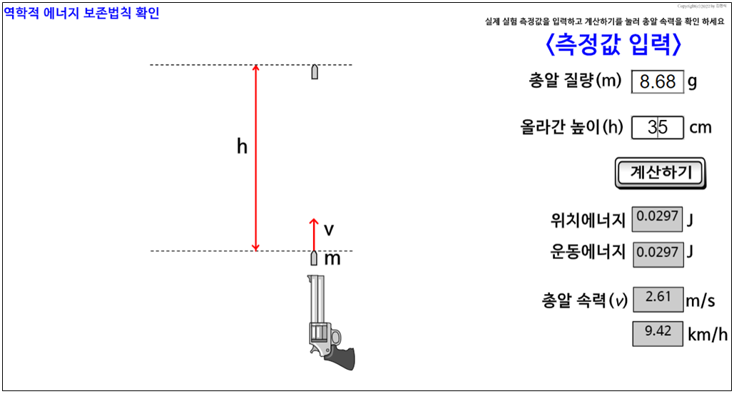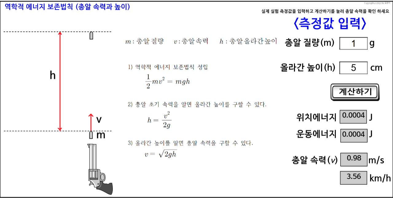 나. 역학적 에너지 보존법칙을 이용하여 총알이 올라갈 높이를 계산하게 한다.