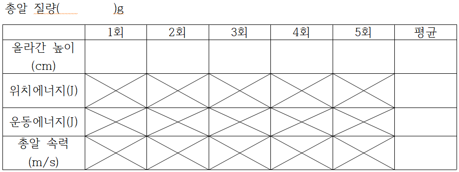 다트총이 발사되는 원리는 스프링의 탄성력을 이용하는 건데, 만약 탄성에너지가 에너지손실 없이 역학적에너지로 전환된 거라면 총알속력을 몰라도, 총알 무게를 바꿔서 얼만큼 올라갈지 알 수 있지 않을까? 위치에너지가 동일하다면....