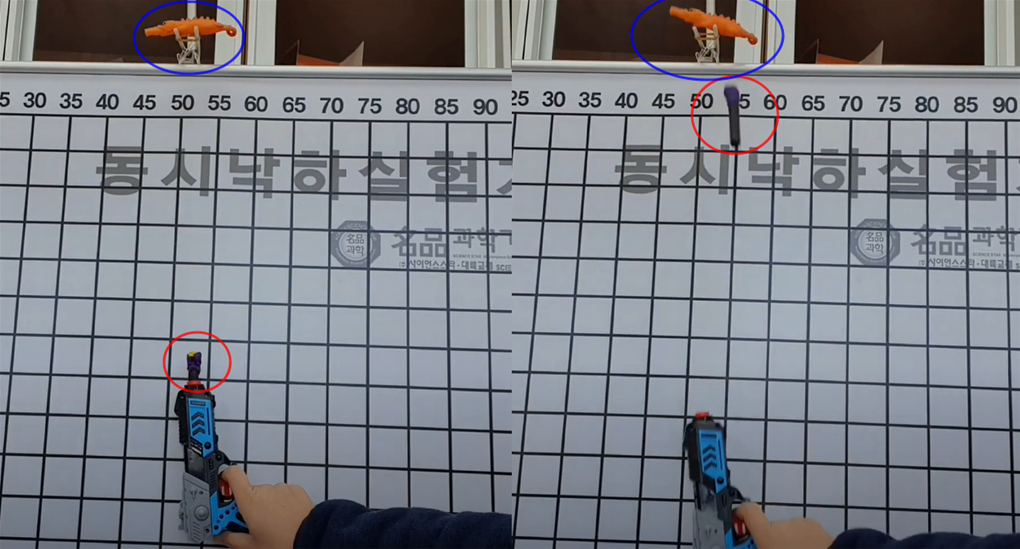 그래서 다트 총을 이용한 실험을 설계해 보았다. 실험이 끝나고 나면 미션을 주어, 높이 올려놓은 물체 떨어지지 않게 살짝 맞추기, 또는 가까이 접근하기 시합을 해보면 재미있다.