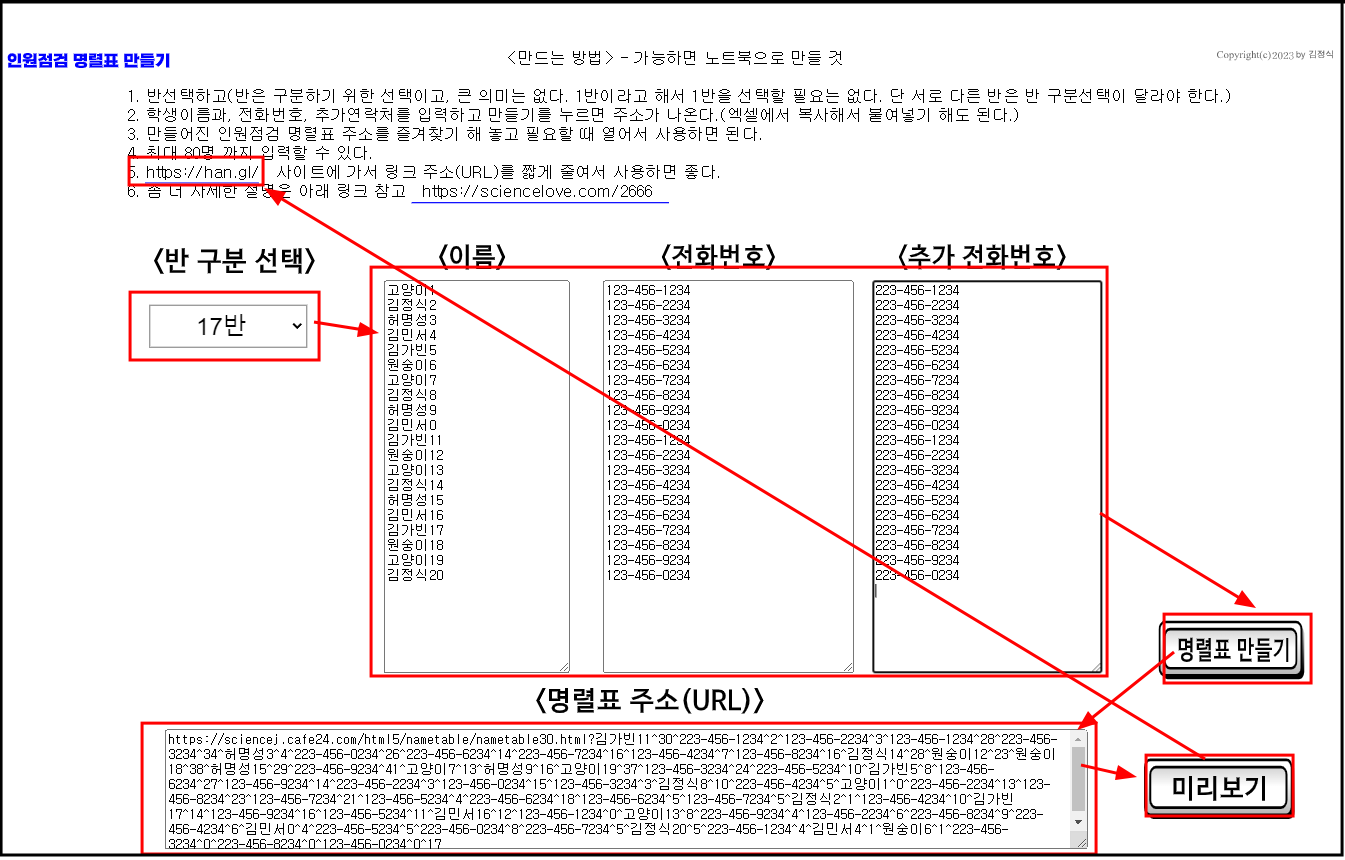 입력이 끝나면 명렬표 만들기를 누르면 명렬표 링크 주소가 만들어진다. 그럼 명렬표 링크 주소를 즐겨찾기 해 놓았다가 필요할 때마다 링크로 접속하기만 하면 된다. 미리보기를 눌러 어떻게 나오는지 확인해 보면 된다.