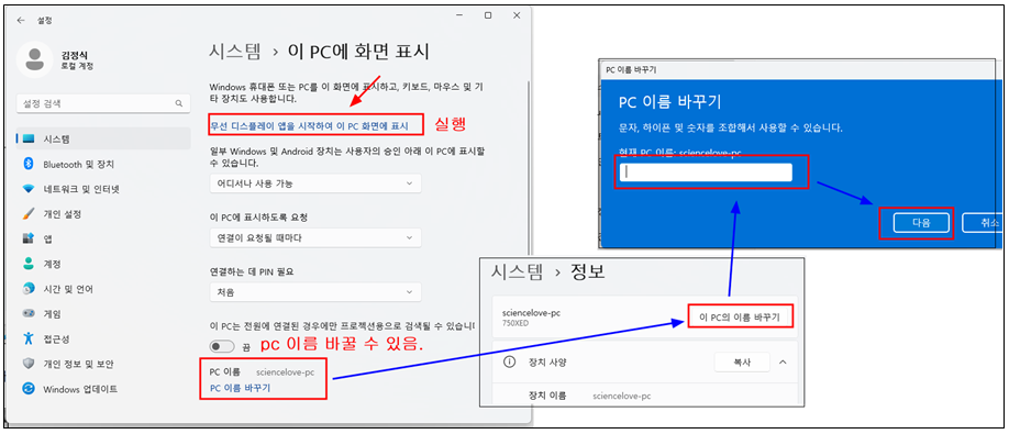 참고로 pc 이름을 바꿔 두면 나중에 접속할 때 편리하다. pc 이름은 이 pc 화면에 표시 창 맨아래 pc 이름바꾸기를 누르고 이름을 바꿔 주면 된다. 참고로 필자는 sciencelove_pc 로 이름을 바꿔 놓았다.