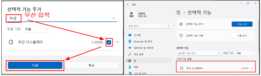 무선 디스플레이 선택하고 다음을 눌러 설치하면 끝.