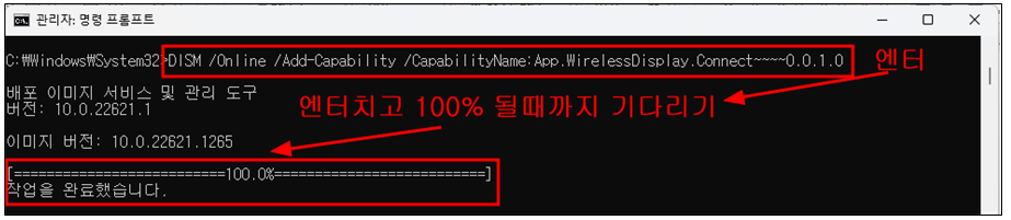 대부분 제대로 설치가 될 것이다. 만약 무선디스플레이를 설치할 때 100% 설치가 되야 하는데 진행바가 중간에 멈추고 한참 지나도 진행이 안되는 경우가 있다. 필자가 그랬다. 그래서 포기할까도 생각 했었다.