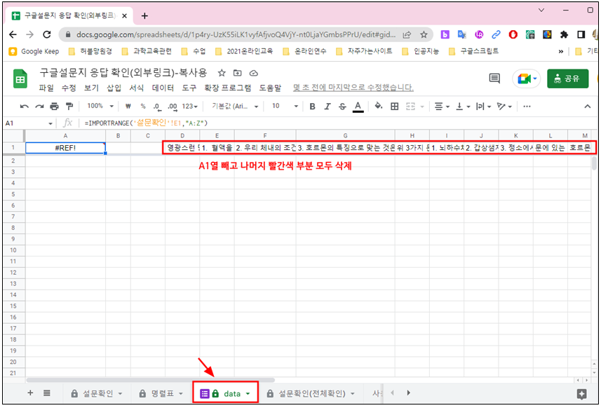 6) 만약 제대로 작동하지 않으면 data 시트에 가서 A1 열 #REF!를 뺀 나머지 부분을 모두 삭제해 준다.