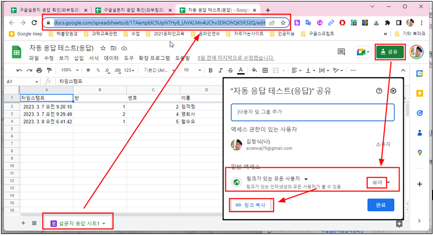 다. 답변 스프레드시트 공유를 눌러 링크가 있는 모든 사용자 뷰어로 바꾼 다음 링크 주소를 복사해 둔다.