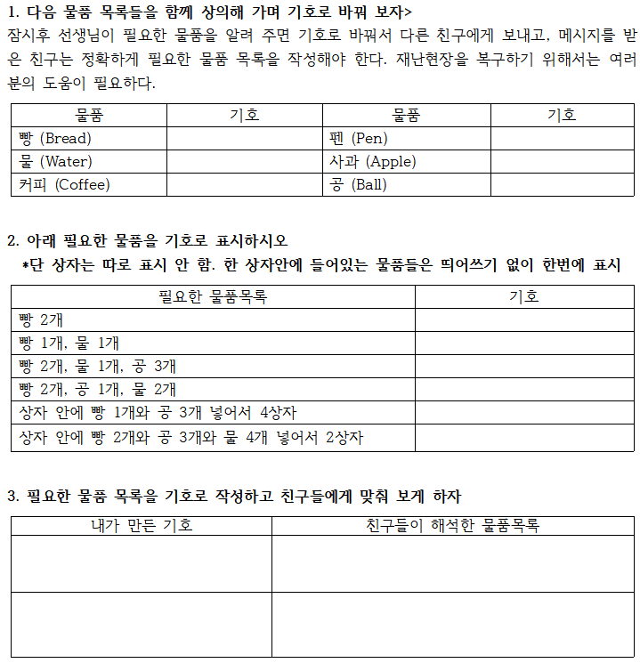잠시후 선생님이 필요한 물품을 알려 주면 기호로 바꿔서 다른 친구에게 보내고, 메시지를 받은 친구는 정확하게 필요한 물품 목록을 작성해야 한다. 재난현장을 복구하기 위해서는 여러분의 도움이 필요하다.