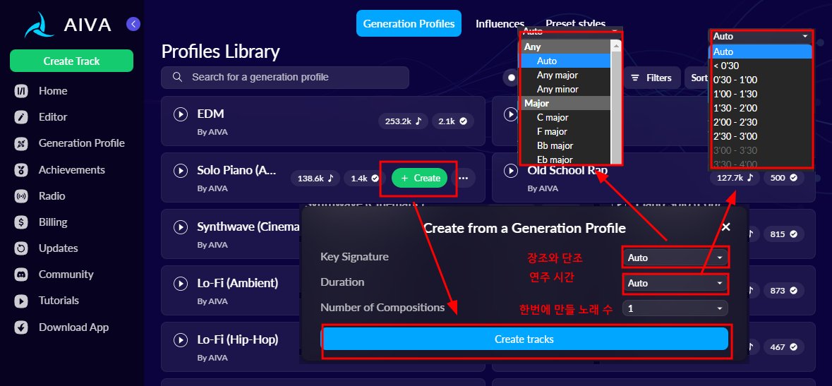 원하는 음악 종류가 정해지면 옆에 Create를 누르고 나타난 화면에서 Create Tracks를 눌러 음악을 만들면 된다. 그냥 아무것도 건드리지 않고 auto 로 놓고 바로 만들 수 있다.