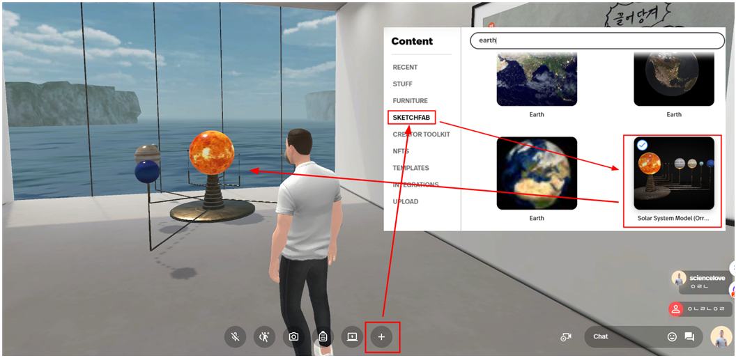 태양계 관련 수업을 할 때 수업과 관련된 3D 행성 모델들을 가져다가 3D 행성들을 살펴 볼 수 있는 나만의 태양계 가상 전시관을 만들어 볼 수도 있고, 지리 시간에는 다양한 지형을 살펴볼 수 있는 전시관을 만들어 볼 수도 있고, 생물시간에는 가상 동물원을 만들어 볼 수도 있다. 잘만 활용하면 정말 재미있는 활동들이 가능하다. sketchfab 사이트와 연동해서 가상공간에 다양한 3D 모델들을 전시해 보자.