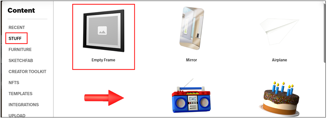 액자를 추가하고 싶으면 + 아이콘을 누르고 STUFF에서 빈 액자(Empty Frame)를 선택하면 된다. 32개의 액자가 기본으로 나타나지만 조금 더 액자가 필요한 경우가 있다. 그럴 경우 추가로 액자를 설치하고 작품을 올릴 수 있다.