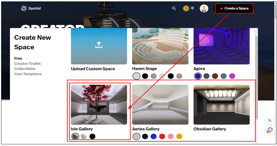 로그인 후 Create Space 를 누르고 보여지는 공간 중에 Free 에 Isle Galley를 선택한다. 다른 갤러리를 선택해도 되지만, Isle Galley 갤러리는 액자가 기본 32개 제공되기 때문에 20-30명 정도 학생들 작품을 전시 하기에 가장 알맞다. (액자는 더 추가하거나, 삭제할 수 있다.)