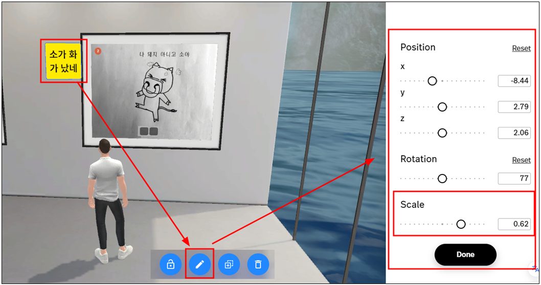 추가된 메모지나 액자를 포함한 모든 사물은 마우스로 위치를 조절할 수 있다. 좀 더 정확하게 조절하고 싶으면 사물을 선택하고 아래쪽 연필모양을 선택하면 위치나 크기를 세밀하게 수치를 직접 입력해서 조절할 수 있다.