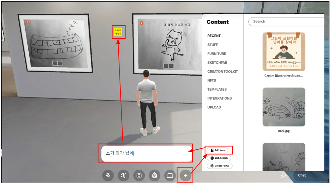 아이콘에서 + 버튼을 누르고 Add Note를 눌러 간단하게 메모를 적어 주고 엔터를 치면 가상공간에 메모지가 나타난다. 그럼 메모지를 적당한 곳으로 옮겨서 배치해 주면 된다. 작품 제목이나 작품을 제작한 학생들 이름이나, 수업과 관련된 간단한 내용을 적어 줄 때 사용할 수 있다.