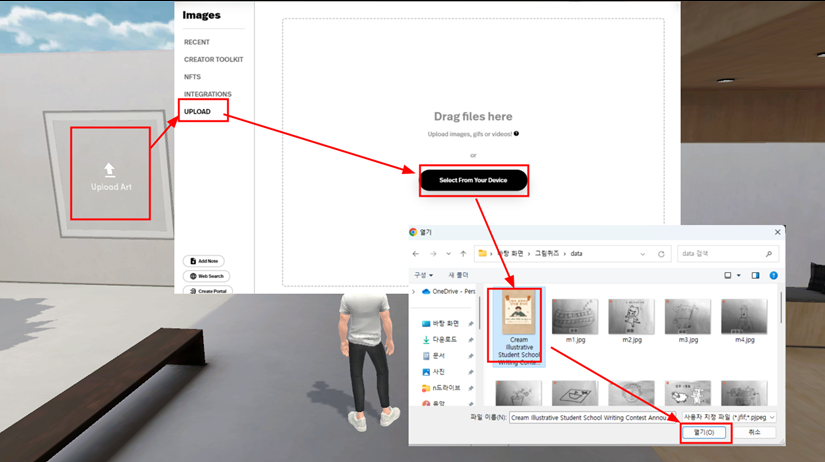 가상 공간이 만들어 지면 벽면에 빈 액자들이 걸려 있는 걸 볼 수 있다. 이제 빈 액자에 작품을 채워 보자. 걸려 있는 액자에 가서 Upload Art 를 누르고 이미지 창이 열리면 upload를 눌러 컴퓨터에 있는 학생들 사진을 선택해서 올리면 된다. (학생들 사진은 미리 받아서 모아 두자.)