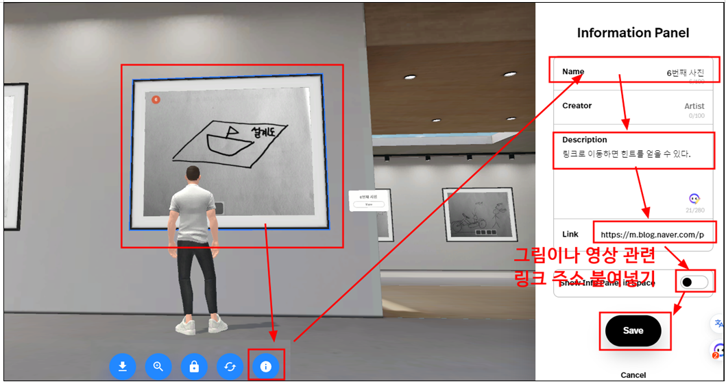- 작품을 선택하고 느낌표 모양의 아이콘을 누르면 작품 제목과 간단한 설명을 적을 수 있다. 그리고 웹사이트나 유튜브 링크 주소를 연결할 수 있다. 긴 영상의 경우에는 유튜브에 올려 놓고 링크를 통해 보게 하면 좋다. 또 뉴스기사 사이트나, 협업사이트로 이동시켜서 다양한 활동을 하게 할 수 있다.