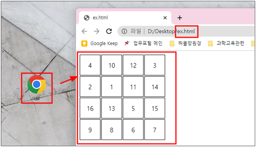 - 바탕화면에 ex.html 파일을 더블클릭 해서 실행시켜 보자. 그럼 크롬 또는 익스플러에서 실행이 된다. 제대로 실행되는지 확인하고, 이상이 있으면 chatGPT 에게 다시 요구해서 수정해 달라고 하자.