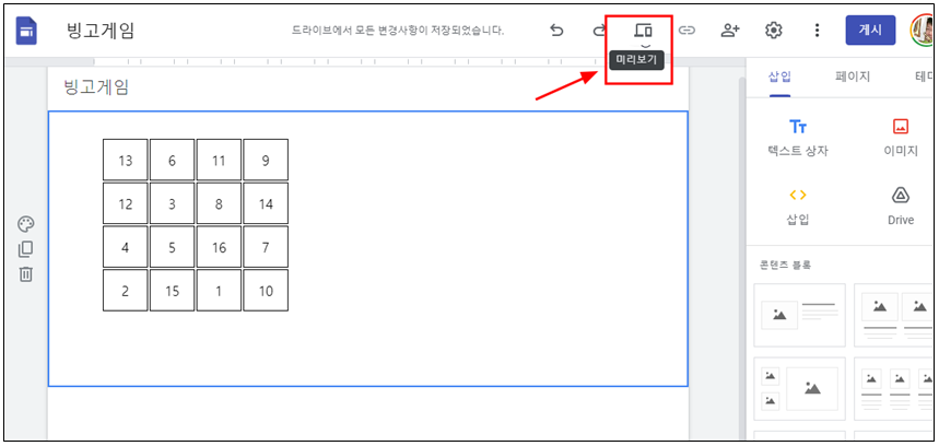 - 그럼 만든 빙고게임이 화면에 삽입된 것을 확인할 수 있다.