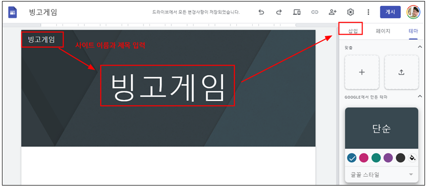 - 제목 입력이 끝났으면 우측에 삽입-삽입을 선택한다.
