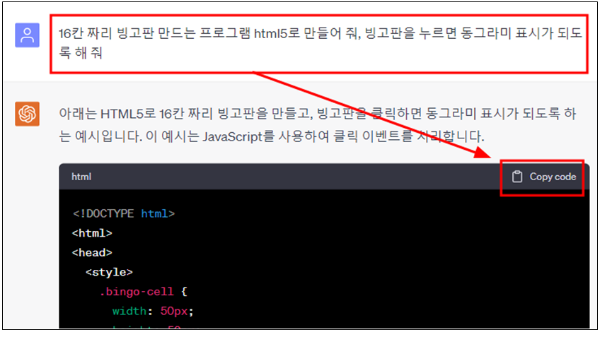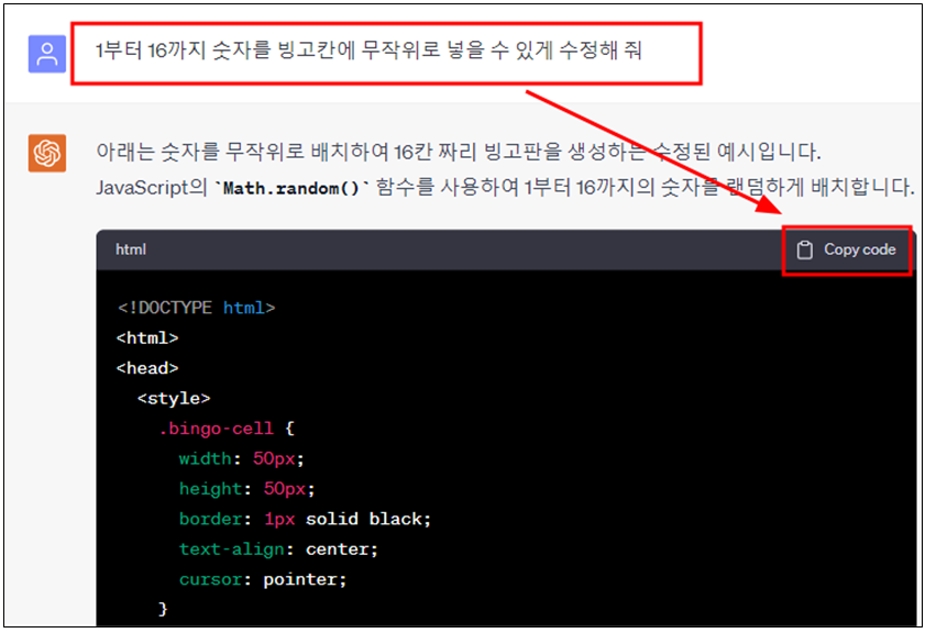 간단한 빙고 게임소스가 완성 되었다. 만들어 준 소스 코드를 복사해서 실행시켜 보자. 실행시켜 보고 마음에 들지 않으면 계속해서 소스를 수정해 달라고 요청하고 같은 작업을 반복하면 된다.