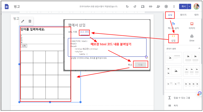 - 웹에서 삽입창이 나오면 소스코드를 선택하고, ex,html 파일을 메모장에서 열어서 소스코드를 모두 복사한 다음 이곳에 붙여넣기를 한다. 그리고 다음을 누르고 삽입을 누른다.