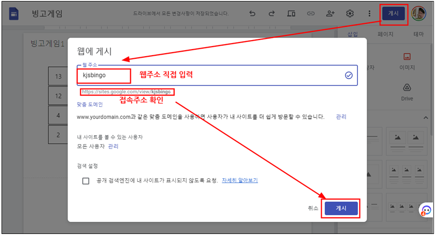 2) 이상이 없으면 접속주소를 확인하고 게시를 누르면 된다.