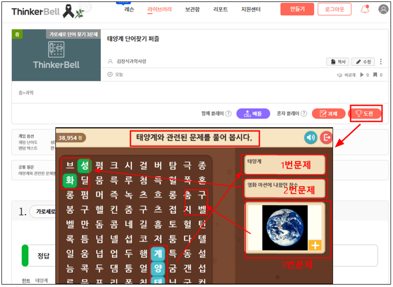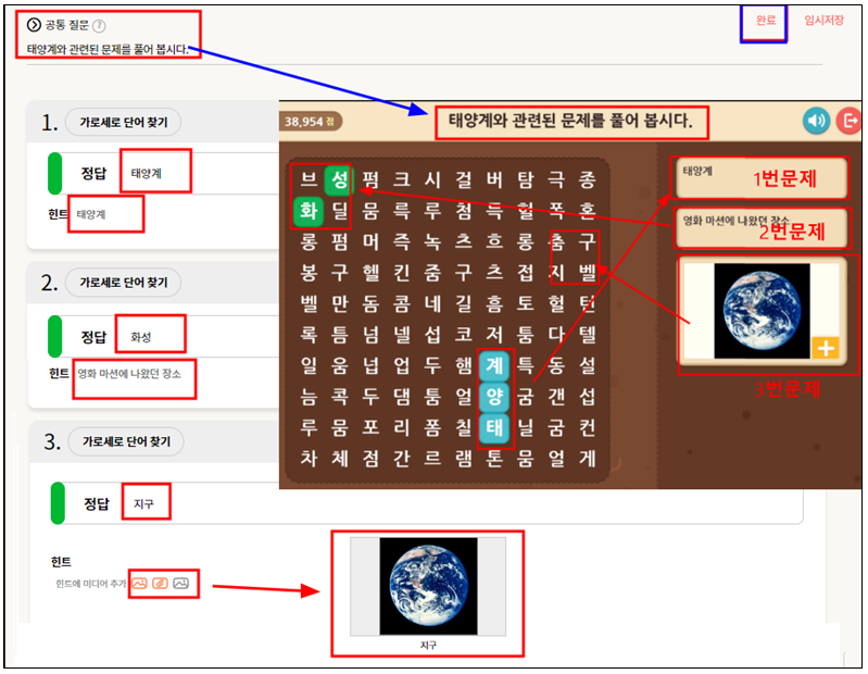 1) 1번 문제의 경우 정답과 힌트가 같다. 즉 우측에 태양계 라는 단어가 보이면 단어찾기 퍼즐에서도 태양계를 찾으면 된다.