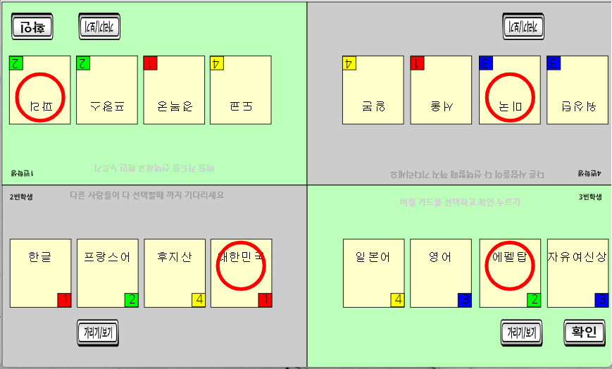 (위 그림에서 2번 학생의 경우 일본과 관련된 카드가 많으니까, 프랑스 카드를 선택해서 버릴 예정이다. 프랑스 카드를 선택하고 확인을 누르면 프랑스 카드는 다른 사람에게 가고, 다른 사람들이 버린 카드 즉 대한민국, 서울, 일본 카드 중에 1개가 임의로 2번 학생에게 오게 된다.