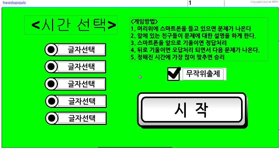 게임시간을 선택하고 시작을 누르면 문제가 나온다.(참가자는 스마트폰을 이마 위에 대야 한다.)