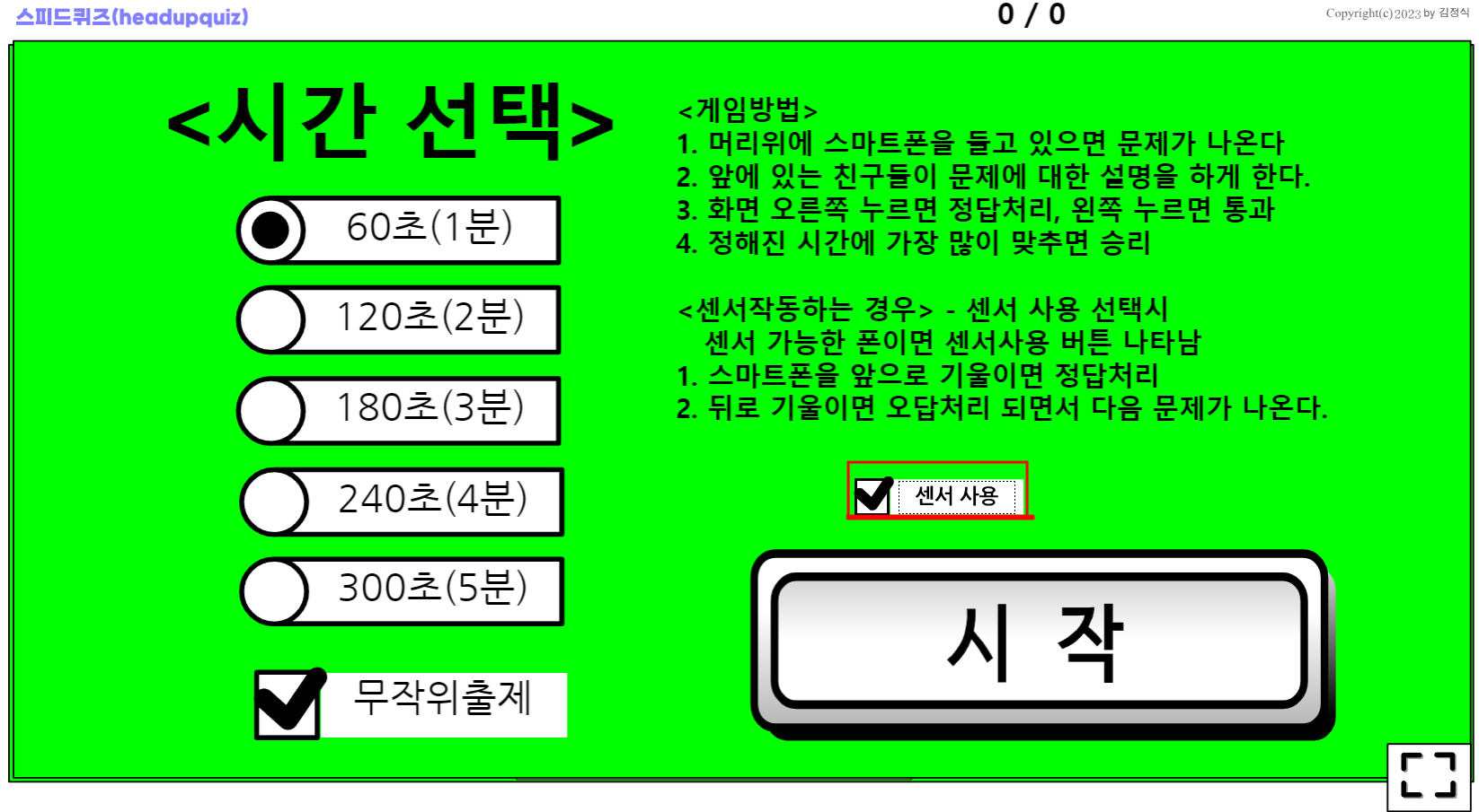 중력센서가 지원이 되는 스마트폰(안드로이드폰)은 시작 버튼위에 센서 사용 체크 버튼이 활성화 된다.