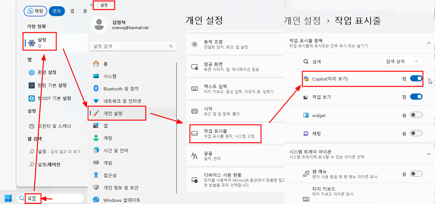 코파일럿이 없는 경우 설정에서 작업표시줄에 보이게 할 수 있다.