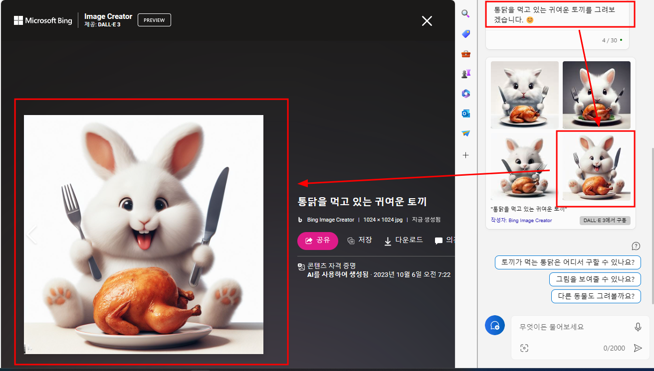 그림도 그려 준다. 통닭을 먹고 있는 귀여운 토끼 그려 줘