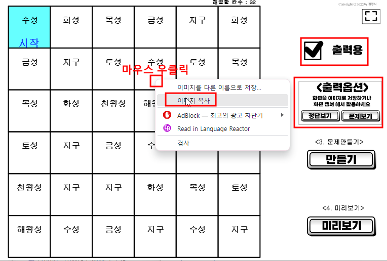 3. 출력용에 체크하면 출력용 버튼이 나온다. 이때 화면을 캡쳐하거나, 이미지 복사해서 한글 학습지에 넣어서 출력해 주면, 태블릿PC 없이 출력물을 가지고 게임을 진행할 수 있다.
