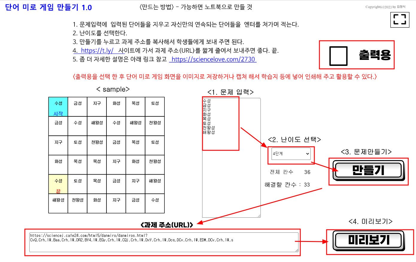 단어미로게임 인쇄용 프로그램은 아래 링크 참고(그런데 이 프로그램에서도 출력이 가능하다. 따라서 앞으로 인쇄용은