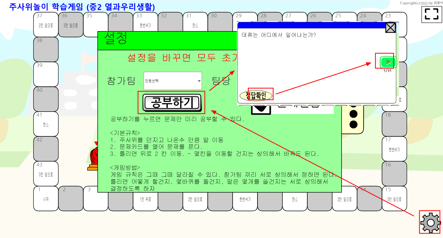 정한 규칙대로 팀별로 주사위를 던지고, 말을 이동하고, 문제를 풀어 가며 게임을 진행하면 된다. 몇바퀴를 돌지, 아니면 말 여러개를 가지고 할지는 게임 전 모둠원들끼리 미리 결정을 하고 시작하자.