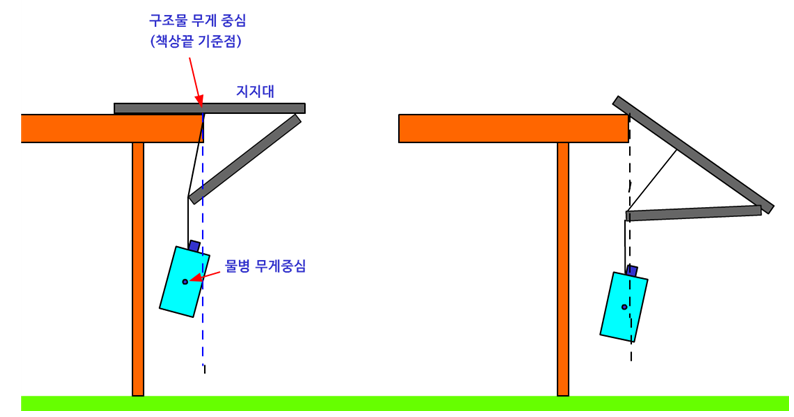 물병이 떨어지지 않는 이유는 책상끝 기준점 보다 전체구조물의 무게중심이 더 안쪽에 위치하기 때문이다. 지지대 역할을 하는 나무젓가락을 조금씩 밀면 전체구조물의 무게중심이 책상끝 기준점 보다 밖으로 나가기 때문에 더 이상 버티지 못하고 지지대 역할을 하는 나무젓가락이 기울어 지면서 떨어지게 된다.