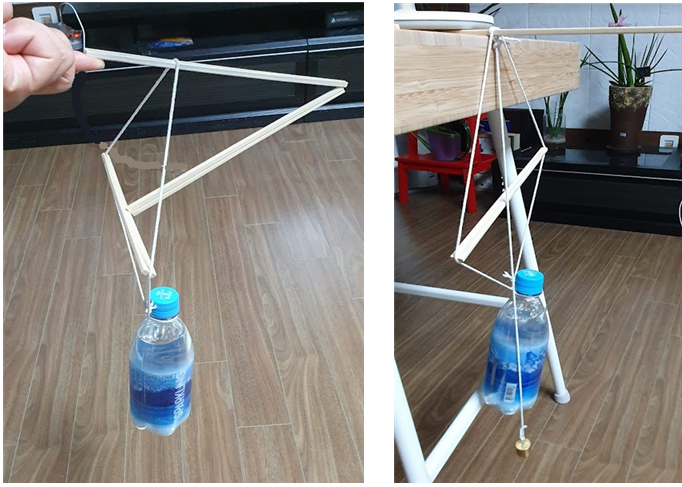 지지대를 잡아 주는 것이 없으면 걸어 놓은 물병이 바로 떨어질 것 같은데, 떨어지지 않고 버티는 것을 보면 신기하다. 과학적으로 접근해 보면 너무나 당연하지만 실제로 보고 있으면 새로운 경험이 될 것이다.