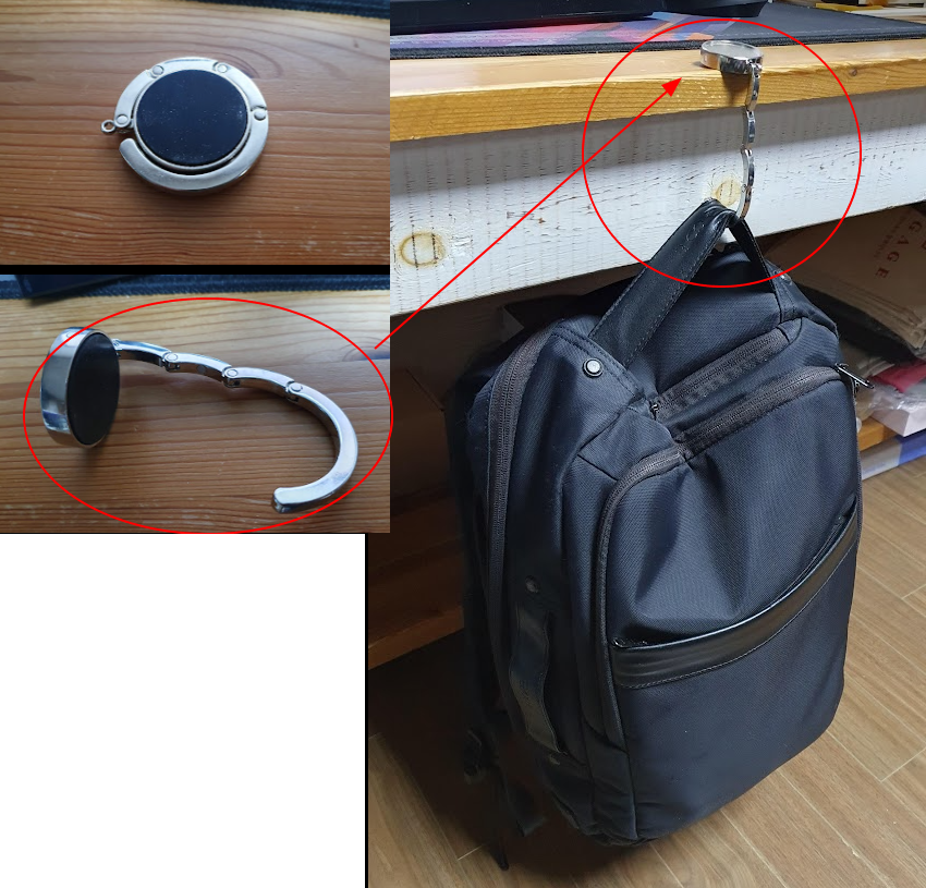 <추가> 같은 원리로 판매되고 있는 휴대용 가방 걸이 - 어떤 책상에든 걸쳐 놀 수 있다. 접착하지 않고 걸쳐 놓고 가방만 걸면 된다. 가방은 떨어지지 않는다.