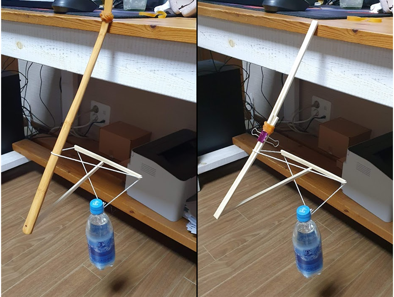 3. 물병이 떨어지지 않게 책상위 나무젓가락은 손으로 누르거나 무거운 물체를 올려놓는다.