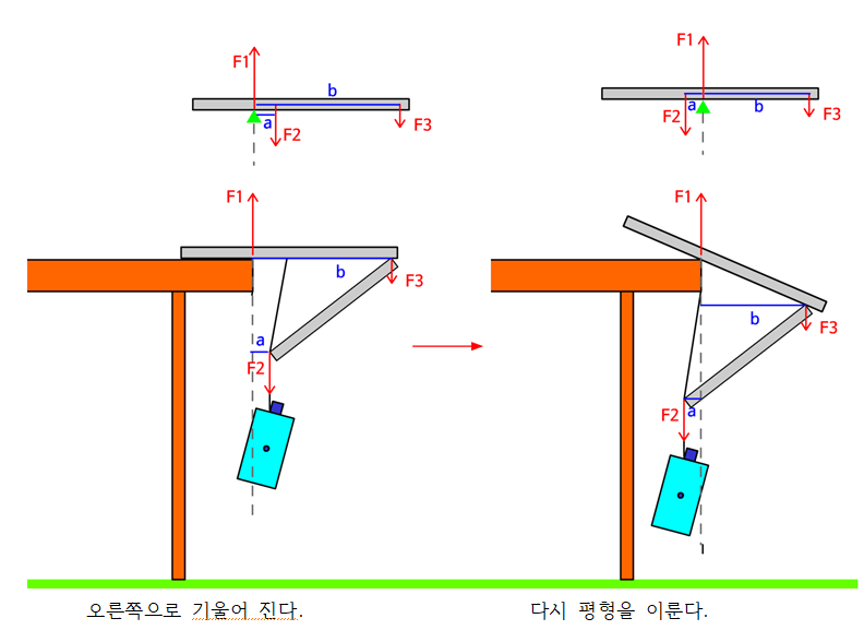 책상위 나무젓가락을 밖으로 최대한 밀면 물병의 무게중심이 책상끝 보다 밖으로 이동하게 되므로 결국 오른쪽으로 회전하면서 떨어지게 된다. 그런데 오른쪽으로 회전하다 보면 물병의 무게중심이 다시 책상끝 기준점 안쪽으로 들어오게 된다. 그럼 다시 돌림힘이 평형을 이뤄 물병은 떨어지지 않게 된다.