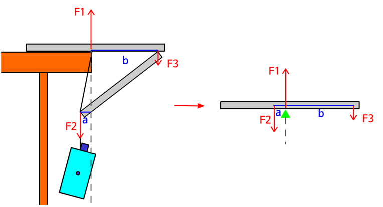 돌림힘은 기준점으로부터 거리×힘 으로 표현할 수 있다. 과학용어로 토크라고도 한다. 현재 책상위 나무젓가락을 최대한 밀어도 물병이 떨어지지 않는 상태라면 전체구조물의 무게중심이 책상 끝에 존재할 것이다. 따라서 책상끝 기준점을 무게 중심으로 잡아 보자. 그럼 F1은 회전에 아무 영향을 미치지 않는다. 여기에서는 무시해도 좋다. 반면에 F2는 반시계 방향으로 회전하려 하고, F3는 시계 방향으로 회전하려고 한다. 모양이 복잡해 보이지만 사실 위 그림에 오른쪽 양팔저울 형태로 간략하게 변형시켜 생각하면 이해하기 쉽다. F2까지의 거리는 기준선으로부터 a 만큼 떨어져 있고, F3까지는 b만큼 떨어져 있으니까 돌림힘이 평형을 이루려면 F2×a = F3×b 가 되야 한다. 그리고 F2 = b/a × F3 가 된다. 이 구조물에서 대부분의 질량은 물병에 있기 때문에 물병이 구조물의 무게중심보다 조금만 안쪽에 있어도 평형을 이뤄 물병은 떨어지지 않는다.